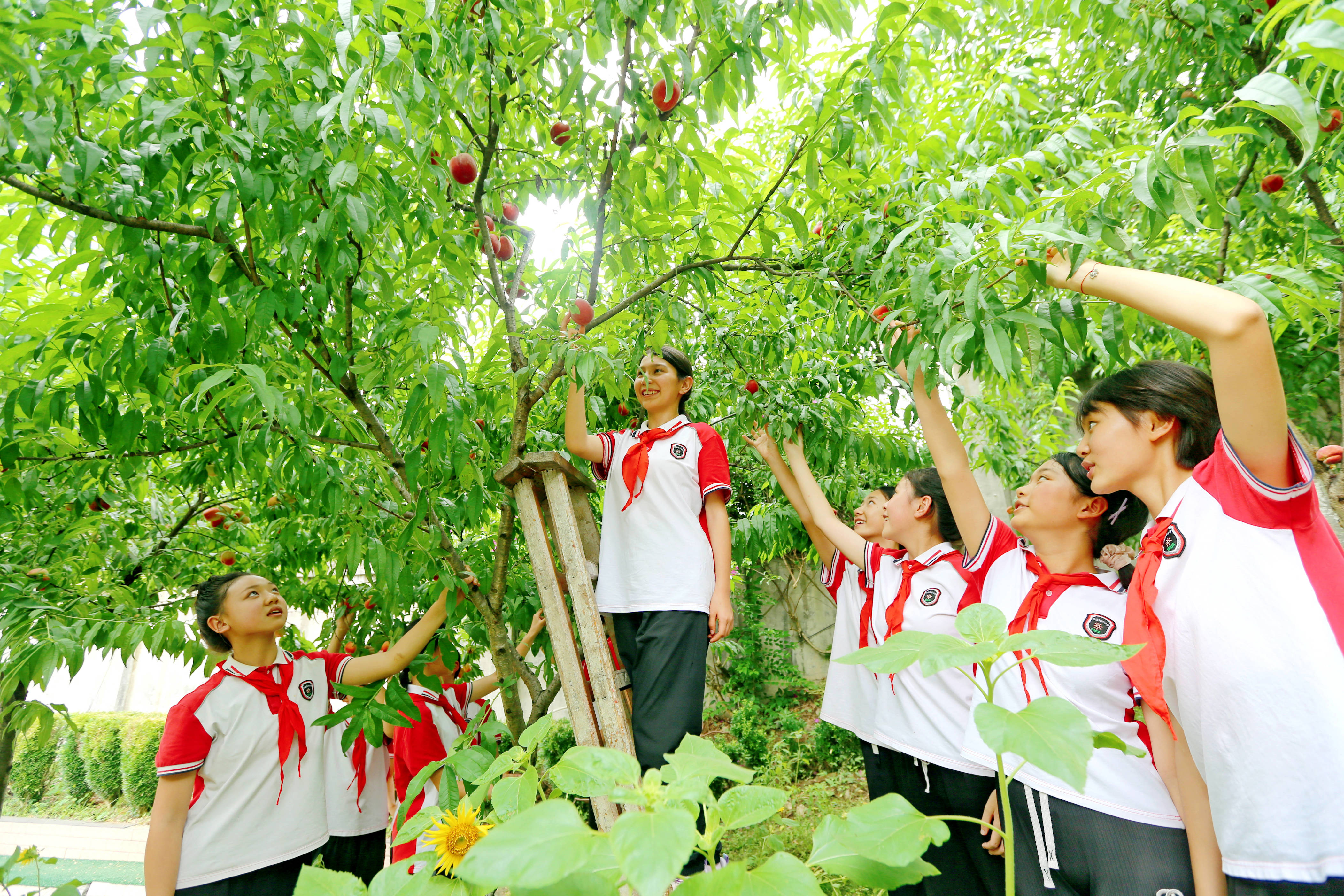 ▲万盛和平小学,毕业生来到校园的桃林摘桃子。