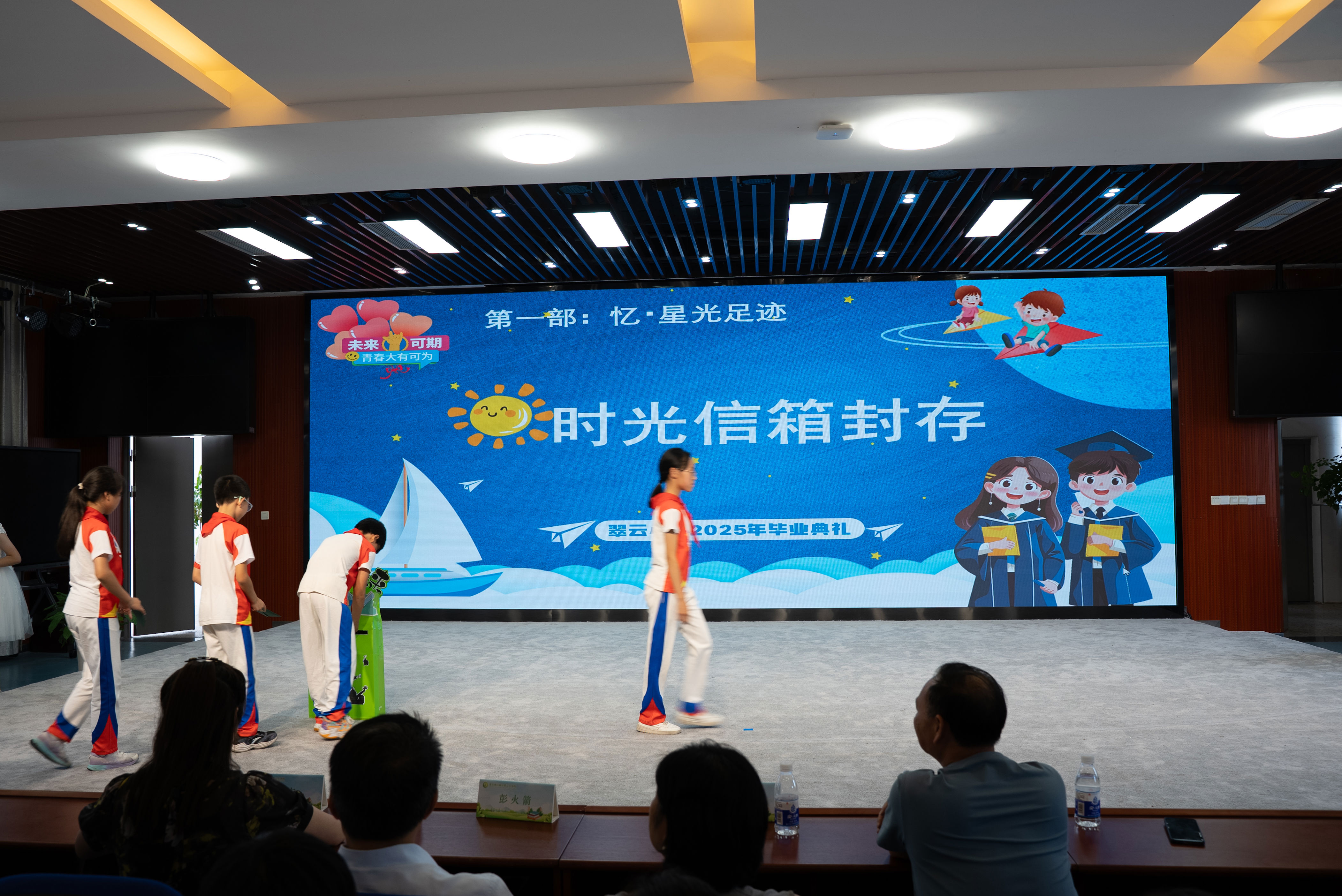 万盛福耀实验学校的毕业典礼现场,通过“时光长廊”播放校园里的生活影像,学生们一起回忆了这六年来的点滴:运动场上的拼搏与欢呼、教室里的朗朗书声、食堂里的烟火气……六年级一班吴庭阅说,“时光长廊”中一帧帧画面凝聚着六年来的点点滴滴,让大家感受到时光的飞逝与成长的珍贵。