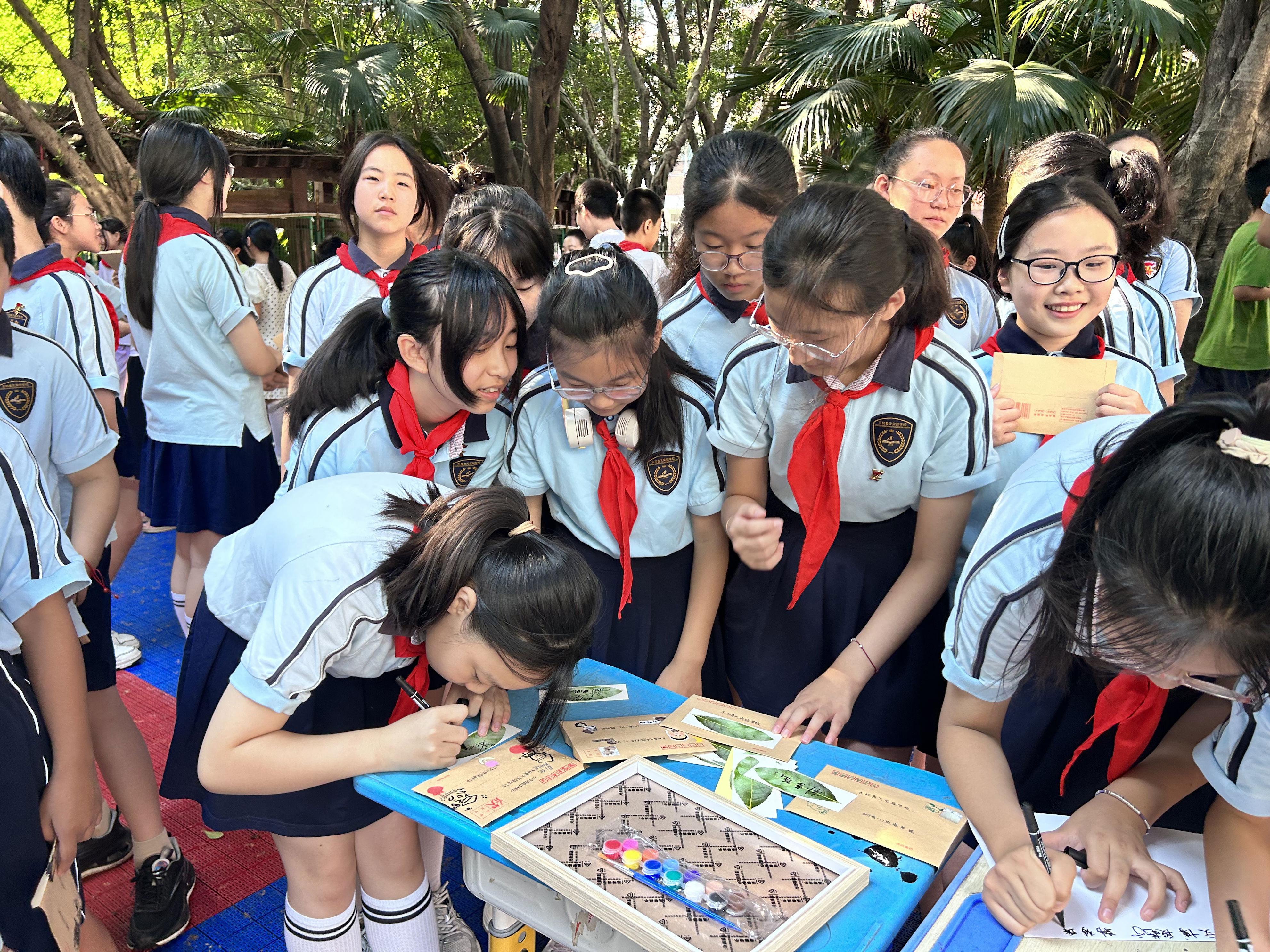 ▲渝北区东和春天实验学校,学生们将自己的名字签在树叶上。