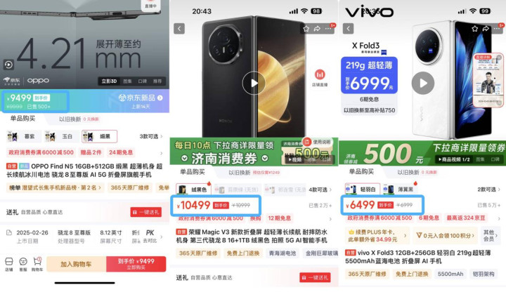 除了iPhone系列,入手OPPO最近全新发布的超薄折叠OPPOFindN5也是不错的选择,原价9999元,领取济南消费券后到手价9499元;荣耀MagicV3新款折叠屏现在也值得入手,原价10,999元,领取济南消费券后到手价10,499元;此外还有vivoXFold3可选,原价6999元,领券后到手仅需6499元。